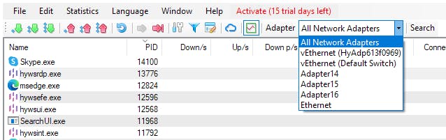 Standaard wordt het verkeer van alle netwerkadapters in kaart gebracht, maar je kunt hier ook aangeven dat je alleen geïnteresseerd bent in één bepaalde netwerkadapter. Bovenaan staat het keuzevak ingesteld op All Netwerk Adapters. Door op het kleine zwarte pijltje te klikken, volg je een bepaalde netwerkadapter. Zo kun je bijvoorbeeld ervoor kiezen om alleen de draadloze adapter of alleen de ethernetadapter te monitoren.