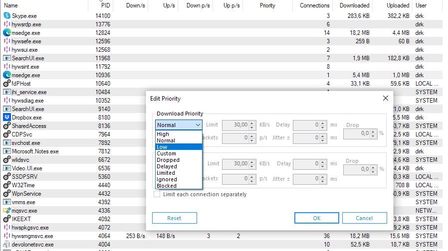 Klik met de rechtermuisknop op de naam van het proces of programma en dan kies je bij Download Priority of Upload Priority de instellingen: Low, Normal, High, Limit …, Block of Ignore. Genegeerde processen werken zonder enig beheer van NetBalancer. Stel dat je het download-enthousiasme van een bepaald programma wilt temperen, dan wijzig je de Dowload Priority in Low. Je zult merken dat de prioriteit van het programma ook wordt aangepast in het overzicht van NetBalancer onder de kolom Priority. Het is ook mogelijk een specifieke limiet in te stellen voor downloads en uploads, door aan te geven hoeveel KB per seconde er maximaal is toegelaten voor deze verbinding.