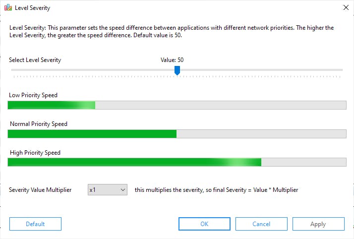 Als je een programma een lage prioriteit toekent, kan het toch zijn dat dit programma de volledige bandbreedte krijgt, omdat er geen programma met een hogere prioriteit actief is. Alleen wanneer een programma met een hogere prioriteit om bandbreedte of snelheid vraagt, zal het programma met een lagere prioriteit voorrang verlenen. Het gaat dus om relatieve verschillen. Via het menu Edit , Level Severity bepaal je hoe groot de prioriteitsverschillen zijn tussen Low Priority Speed, Normal Priority Speed en High Priority Speed. Als je de schuifregelaar naar rechts beweegt, zullen de verschillen groter worden.