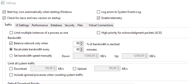 Bekijk zeker ook eens de instellingen. Via Edit, Settings kom je bij enkele interessante instellingen. In het tabblad UI Settings kun je de eenheid aanpassen die wordt gebruikt om het netwerkverkeer weer te geven. Lees je liever KB of MB, Byte of Bit? In het tabblad Traffic kun je instellen dat NetBalancer pas de voorrangsregels zal toepassen wanneer een bepaalde bandbreedte is bereikt. Zet een vinkje bij Balance netwerk only when en dan geef je een bijvoorbeeld 80% van totale bandbreedte. Je kunt de periode instellen waarna de bandbreedte opnieuw berekend moet worden met Set bandwith speed every x minutes. Daaronder in het vak Limit all system trafic kun je het globale netwerkverkeer beperken, zowel op het vlak van downloads als uploads.