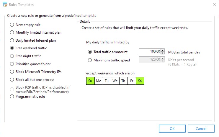 Nog handiger zijn de verschillende kant-en-klare sjablonen voor regels. Zo kun je zonder moeite het verkeer naar een bepaalde game-map op de harde schijf prioriteit geven, of de prioriteiten vastleggen die alleen tijdens de werkdagen gelden, terwijl in het weekend de teugels van het netwerkverkeersbeleid wat losser mogen. Het voordeel van regels is dat ze een tijdpaneel hebben waar je de uren, de dag van de week en/of maand kunt selecteren om de juiste prioriteit voor dat verkeer in te stellen. Zo is het mogelijk om twee verschillende regels met andere instellingen te maken voor verschillende tijdsperioden van de dag.