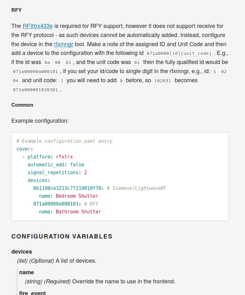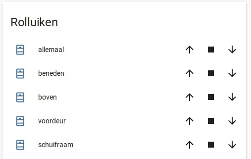 Rolluiken, jaloezieën, rolgordijnen en andere vormen van zonwering, maar ook garagepoorten, vallen in Home Assistant onder de component cover. In de online documentatie van Home Assistant vind je de verschillende ondersteunde apparaten en hoe je ze configureert. Wij gebruiken rolluiken met Somfy RTS-motoren, die we via de RFXCOM RFXtrx433E usb-transceiver draadloos kunnen aansturen. Helaas kan de RFXtrx433E alleen RFY-signalen uitzenden en niet ontvangen, waardoor je de rolluiken niet automatisch kunt toevoegen. Je dient daarom met het programma RFXmngr een ID en Unit Code voor elk van je rolluiken in te stellen. Daarna voeg je je rolluiken in je configuration.yaml toe met als identificatiecode 071a0000[ID][Unit Code].