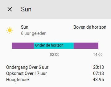 Standaard voegt Home Assistant aan zijn configuratie al de component Sun toe, waarmee je de positie van de zon kunt opvragen, evenals de volgende zonsopgang en zonsondergang. Dat vereist wel dat je in je configuration.yaml de juiste coördinaten van je locatie ingevuld hebt. In het menu Ontwikkelaarstools / Toestanden krijg je alle attributen van de component te zien als je zoekt op de naam sun.sun. In de online documentatie zie je dat je op twee gebeurtenissen van de component kunt reageren in je automatiseringsregels: sunrise (zonsopgang) en sunset (zonsondergang).