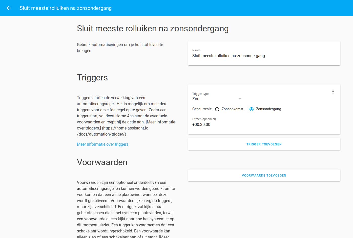 Geef je automatiseringsregel eerst een naam. Dat is belangrijk om later in een hele lijst regels degene terug te vinden die je nodig hebt. Daarna zie je drie onderdelen: triggers, voorwaarden en acties. Kies bij Trigger-type voor Zon, selecteer daar bij Gebeurtenis Zonsondergang en vul bij Offset de vertraging in om de regel te activeren, zoals +00:30:00 als dit een halfuur na zonsondergang moet gebeuren. Een voorwaarde hebben we hier niet nodig (maar zie het kader ‘Sluit jezelf niet buiten’ als je een zekerheid wilt inbouwen).