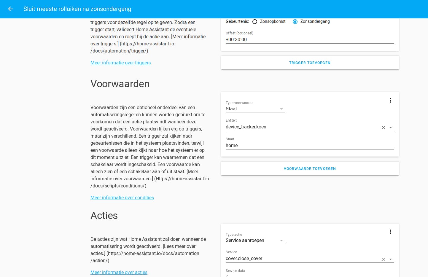 Denk goed na over wat je precies automatiseert. Je zou de eerste niet zijn die zichzelf uit zijn huis buitensluit door automatisch rolluiken te laten sluiten. Merk op dat dat onze automatiseringsregel voor ’s avonds “Sluit meeste rolluiken na zonsondergang” heet … Als je toch alle rolluiken automatisch wilt sluiten, kun je een voorwaarde toevoegen met aanwezigheidsdetectie (zie de masterclass over Home Assistant), zodat de regel eerst test of je wel binnen bent. Maar elke aanwezigheidsdetectie heeft zijn beperkingen. Traceer je bijvoorbeeld je smartphone via wifi, dan blijf je voor Home Assistant nog ver rond je huis ‘thuis’. Heb je twijfels over een automatiseringsregel, stel die dan vooral niet in.