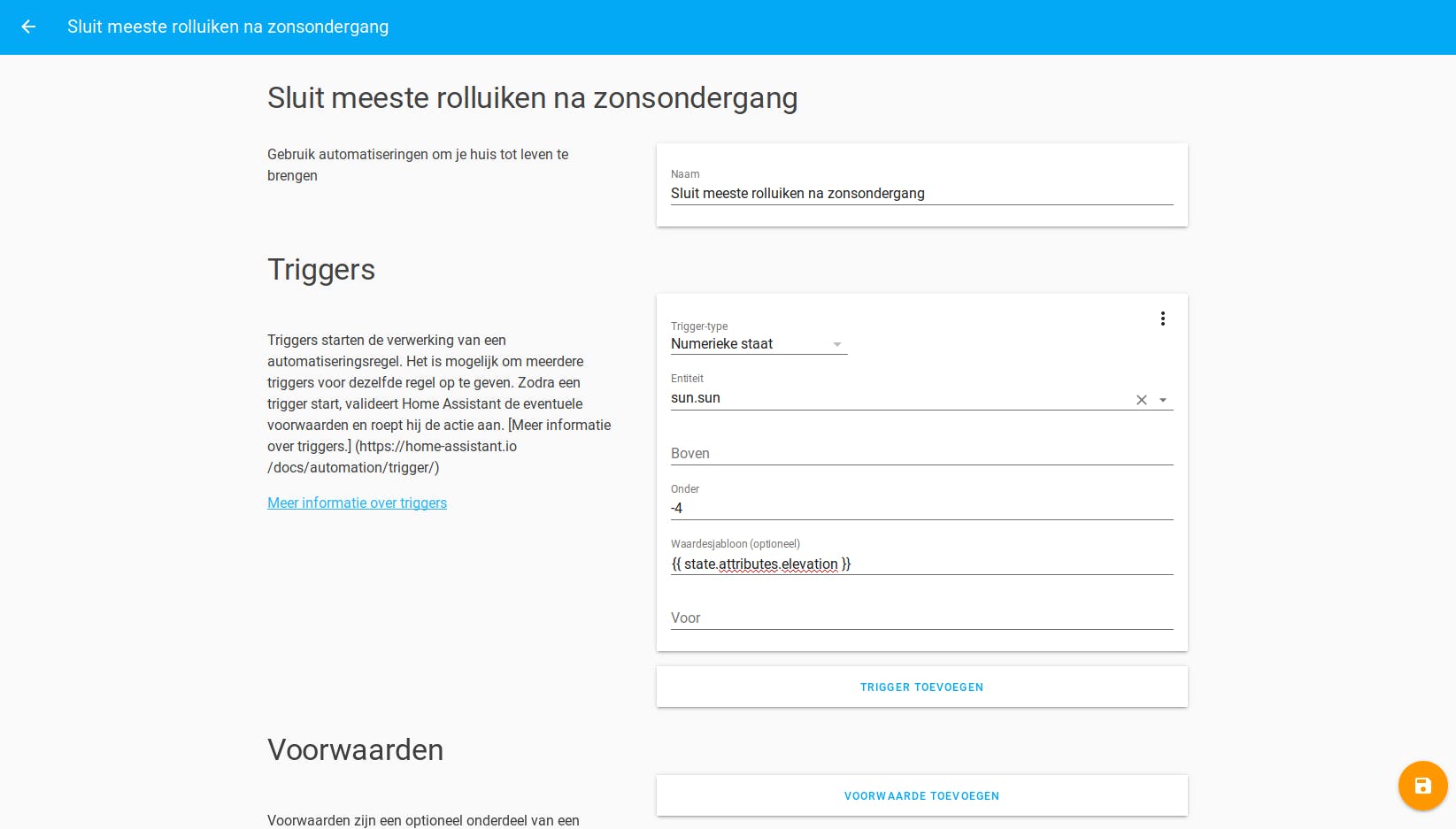 Voor de volledigheid moet je nog een extra automatiseringsregel aanmaken die bij zonsondergang de booleaanse invoerwaarde inschakelt. Dat zorgt er namelijk voor dat de automatiseringsregel niet ’s nachts probeert je rolluiken omhoog te doen (in het zeldzame geval dat de temperatuur de hele dag niet is toegenomen en ’s avonds/’s nachts wel toeneemt).