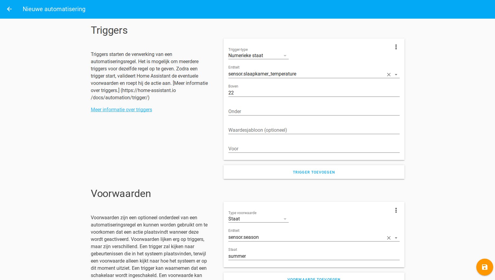 Herstart daarna Home Assistant en maak een nieuwe automatiseringsregel aan. Kies bij Trigger-type voor Numerieke staat en kies de gewenste temperatuursensor uit de lijst met entiteiten. Vul dan bij Boven je drempelwaarde in, bijvoorbeeld 22. Klik daaronder op Voorwaarde toevoegen, laat het type voorwaarde op Staat staan en kies als entiteit sensor.season. Vul bij Staat de waarde summer in. Zo wordt onze actie alleen in de zomer uitgevoerd wanneer het warmer dan 22 graden wordt. In de andere seizoenen vinden we die temperatuur niet erg!