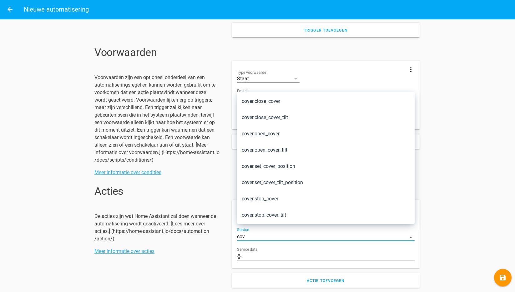 In de actie kies je bij Type actie weer voor Service aanroepen en bij Service voor de juiste actie. Wij gebruiken de rolluiken op het zuiden en oosten als zonwering, dus we kiezen hier weer cover.close_cover. Als het bij jou om een zonnescherm gaat, dan gebruik je cover.open_cover. En met cover.set_cover_position is het mogelijk om een exacte positie aan te geven. Welke service je ook kiest, bij Service data vul je de lijst met ID’s van je zonwering in, zoals in stap 8, maar dan deze keer wellicht alleen die aan je zuidkant en eventueel het oosten.