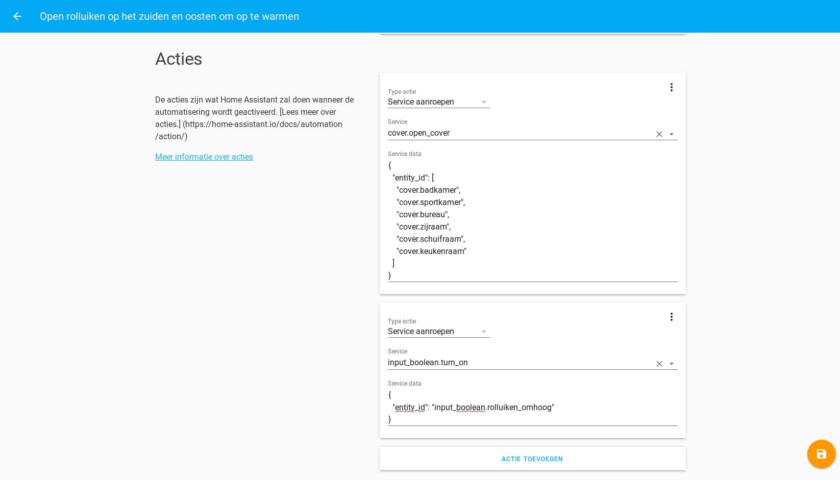 Maak nu een actie aan om de gewenste rolluiken te openen. Dat werkt hetzelfde als in stap 8, maar dan met als service cover.open_cover. Klik daarna op Actie toevoegen voor een tweede actie. Kies als service input_boolean.turn_on en vul bij Service data het volgende in: