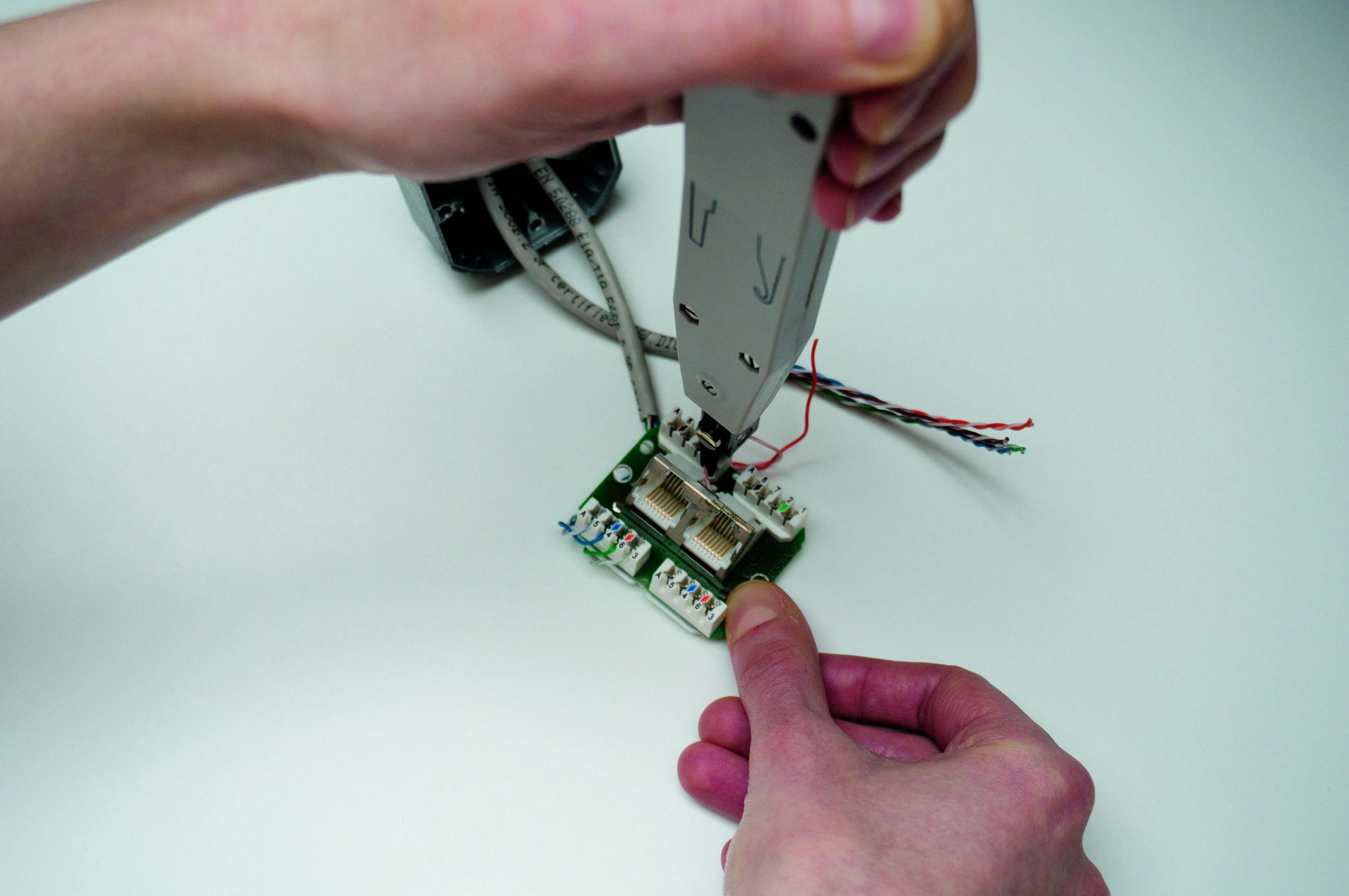 Haal eerst een stukje buitenmantel van je netwerkkabel en knip indien aanwezig het binnenkruis weg. Ontvlecht de aderparen niet, die moeten zo veel mogelijk bij elkaar blijven. Voer de kabels door in je wandcontactdoos of patchpanel. Leg de acht aders vervolgens over de juiste aansluiting van de LSA-strook. Gebruik de kleuren die als B vermeld staan. Leg de ader een beetje vast over de strook en zet de punch-down-tool op de LSA-strook. Druk de punch-down-tool vervolgens in tot je een klik hoort. Sluit alle aders aan, de overbodige stukjes draad worden tijdens het aandrukken door de punch-down-tool netjes afgesneden. Draag een (veiligheids)bril om te voorkomen dat een stukje draad in je oog schiet. Wanneer alle aders zijn aangesloten, monteer je de netwerkaansluiting of patchpanel verder af.
