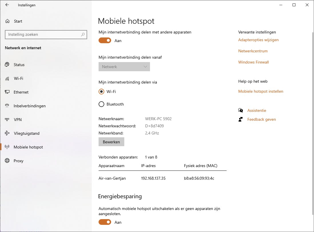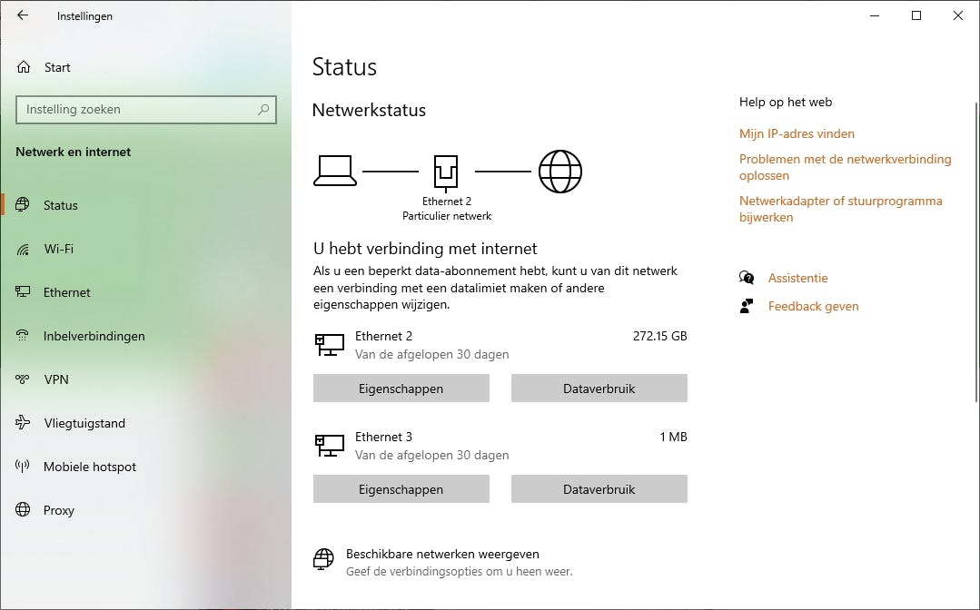 Onder Windows heb je geen extra software nodig. De verbindingseigenschappen kun je controleren door de Windows-instellingen te openen (Windows-toets+I). Ga dan naar Netwerk en internet. Hier zie je de verbinding (aangemerkt als ethernetverbinding). Het dataverbruik wordt apart bijgehouden, net als voor de andere verbindingen. Onder Windows deel je deze verbinding eventueel weer met andere gebruikers door de mobiele hotspot aan te zetten, vooropgesteld dat de computer ook voorzien is van wifi (zie ook het kader ‘Mobiele hotspot onder Windows’).