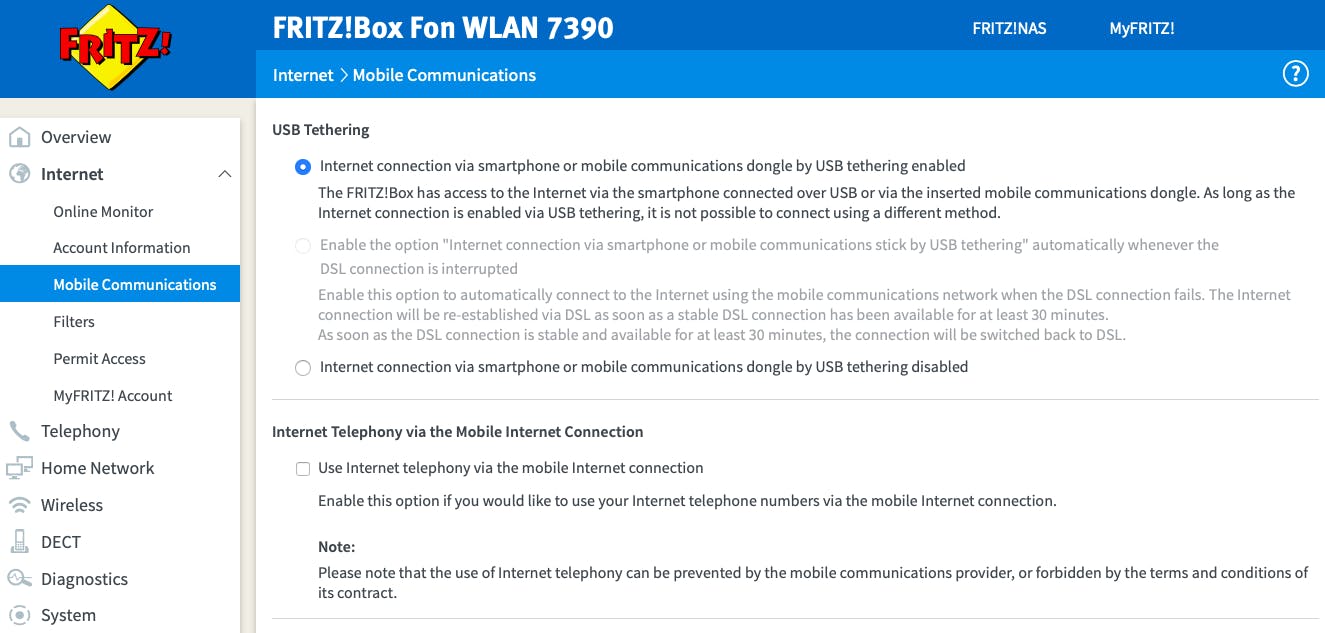 Sluit de smartphone via usb aan op de router en activeer zoals hierboven uitgelegd usb-tethering op je toestel. Mogelijk moet je via de gebruikersinterface van je router nog enkele instellingen maken. In de volgende paragraaf laten we zien hoe dat werkt met een wat oudere Fritz!Box van AVM. Bij routers van providers zijn usb-functies overigens beperkt of zelfs afwezig. Een uitzondering is de Experiabox V10 die door KPN en Telfort wordt geleverd. Hierop werkt usb-tethering wel en zelfs zonder extra instellingen. De procedure: haal de internetkabel eruit, sluit de smartphone aan, zet hierop usb-tethering aan en herstart indien nodig de router. Overigens kun je de usb-poort op de router verder nergens voor gebruiken, maar dit is een handige optie om achter de hand te hebben!