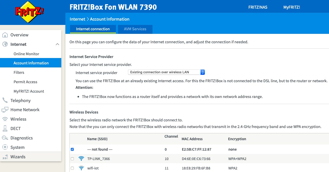 Behalve via usb kun je zoals gezegd soms ook wifi gebruiken voor de inkomende verbinding, afhankelijk van de router. En dat kan ook de wifi-hotspot van de smartphone zijn. Andere apparaten verbind je daarna rechtstreeks met je router, al dan niet via wifi, en ze profiteren in ieder geval van het betere bereik van je router, door de krachtigere antennes. Daarnaast geeft de router je natuurlijk ook meer beheermogelijkheden. Je kunt op de smartphone nog de keuze maken of de wifi-hotspot op 2,4 GHz of 5 GHz moet werken, ook afhankelijk van de mogelijkheden van de router. In de Fritz!Box kun je de verbinding daarna instellen via de gebruikersinterface onder Internet / Account Information. Kies onder het kopje Internet Service Provider voor Existing connection over wireless LAN. Hier vind je als het goed is de hotspot van je smartphone terug om verbinding mee te maken.