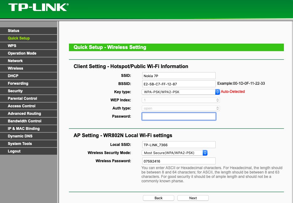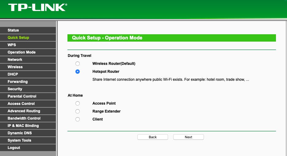 Voor de configuratie gebruiken we een laptop die we via wifi met de reisrouter verbinden. De SSID en het wachtwoord staan op de behuizing, net als de inloggegevens voor de gebruikersinterface. Die gebruikersinterface bereik je via het adres http://tplinkwifi.net. Voor de configuratie gaan we via het menu naar Quick Setup. Hier kies je eerst de werkstand. De router ondersteunt er meerdere. We selecteren Hotspot Router Mode. Hierbij kun je een persoonlijke wifi-hotspot maken op basis van een ander wifi-netwerk. Dat kan de wifi-hotspot van je smartphone zijn, maar ook de wifi-toegang van een hotelruimte of publieke locatie. Als verbindingstype kies je Dynamic IP. Hierna wordt gescand naar wifi-netwerken. Selecteer de wifi-hotspot van je smartphone en stel in het volgende scherm het wachtwoord in. Na een reboot maakt de reisrouter verbinding met de smartphone en kun je je apparaten met de reisrouter verbinden. De netwerkpoort werkt hierbij overigens als een lan-poort, zodat ook apparaten met (alleen) een vaste netwerkaansluiting de internetverbinding kunnen benutten!