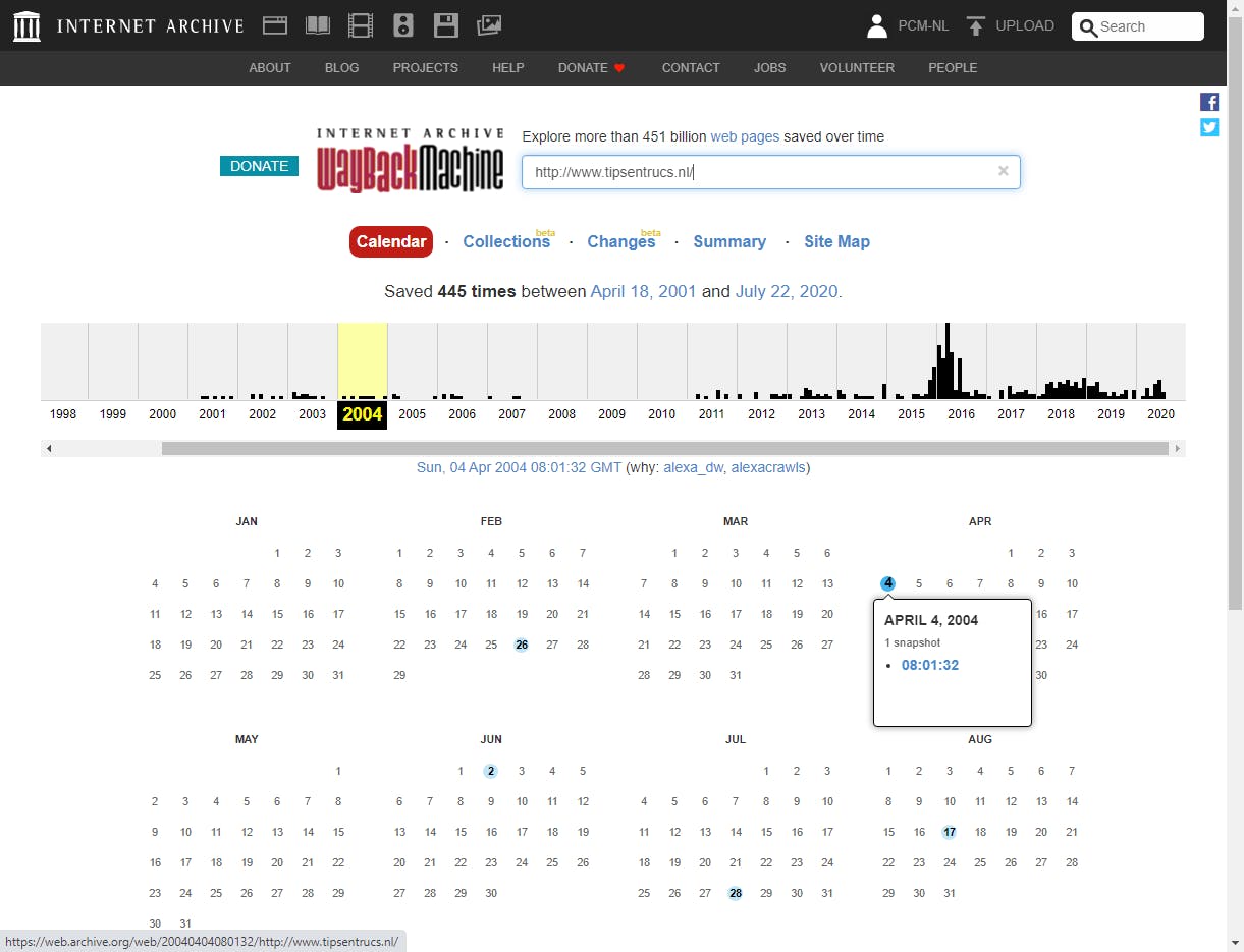Voor wie op zoek is naar informatie die nu verdwenen lijkt, kan het Internet Archive uitkomst bieden. Naast gespecialiseerde zoekmachines, onder meer voor (gratis) boeken en media, vind je hier ook de Wayback Machine. Deze zoekmachine heeft zo’n 450 miljard webpagina’s van weleer geïndexeerd. Zodra je hier de url van een webpagina invult en op Browse History klikt, verschijnt er een tijdlijn met snapshots van die pagina.