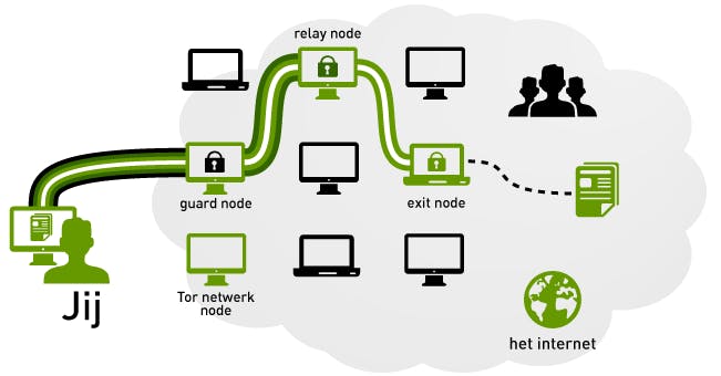 De naam ‘onion’ verwijst naar de manier waarop het dark web in elkaar steekt, zoals het initieel werd ontwikkeld door de Amerikaanse marine. Het is opgebouwd uit een netwerk van servers ofwel nodes, die als relay (tussenstation) dienen tussen de zender (je browser) en de bestemming (de beoogde webserver). Daarbij gaan de data telkens over een ander, willekeurig pad, via verschillende servers waarbij iedere server telkens een versleutelde laag van de routinginformatie ontcijfert, vergelijkbaar met het verwijderen van uienschillen. Dit verklaart meteen de naam van dit netwerk: Tor; The Onion Router. De gegevens worden net zolang naar een volgende server doorgestuurd tot de geheel ontcijferde data bij de bestemming belanden. Onderweg is het dus niet mogelijk de bron of de bestemming van de gegevens te bepalen.