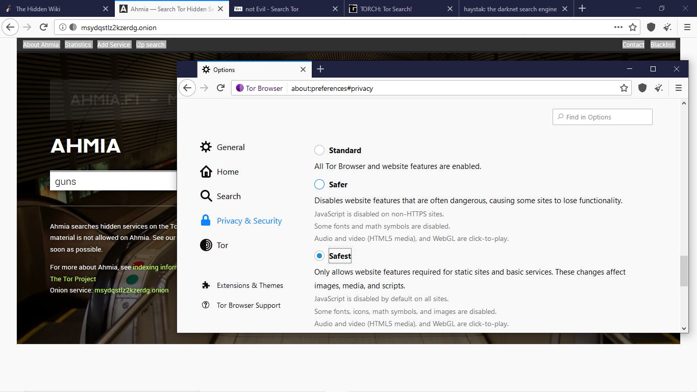 Met een dubbelklik installeer je de applicatie. Start Tor en druk op Connect. Tor heeft weliswaar al een aantal beveiligings- en anonimiseringsfuncties ingebouwd, maar die kun je nog verder aanscherpen. Klik rechtsboven op het schild-icoontje kies Advanced Security Settings en stel het beveiligingsniveau eventueel in op Safest. Houd er dan wel rekening mee dat (mediabestanden van) sommige websites niet langer goed zullen doorkomen. En besef je dat het surfen via Tor en het Tor-netwerk vaak merkbaar trager is. Je kunt met Tor probleemloos reguliere websites bezoeken, maar zoals gezegd kun je er dus ook het dark web mee op. Het volstaat een correct (.onion-)adres in te tikken, bijvoorbeeld dat van zoekmachine DuckDuckGo: https://3g2upl4pq6kufc4m.onion.