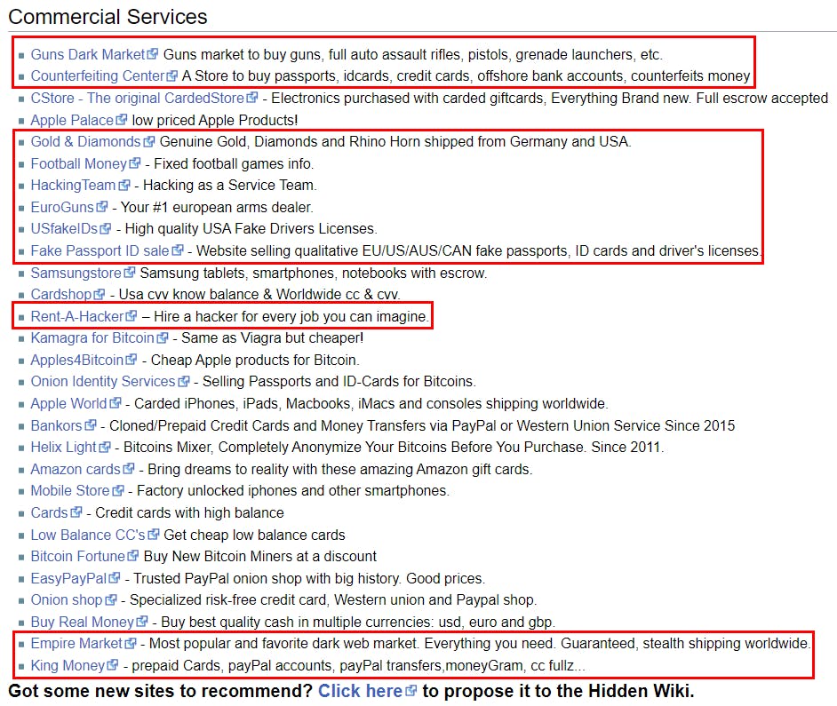 The Hidden Wiki lijkt op een gewone wiki, maar vergis je niet: de links in de rubriek Financial Services en Commercial Services vertellen je meteen dat het hier niet altijd even braaf aan toe gaat. Erg handig evenwel is de rubriek Introduction Points. Die bevat namelijk een aantal links naar heuse dark web-zoekmachines, waaronder Ahmia, Torch en Not Evil. Wij willen hier nog The Haystak (https://haystakvxad7wbk5.onion) aan toevoegen.