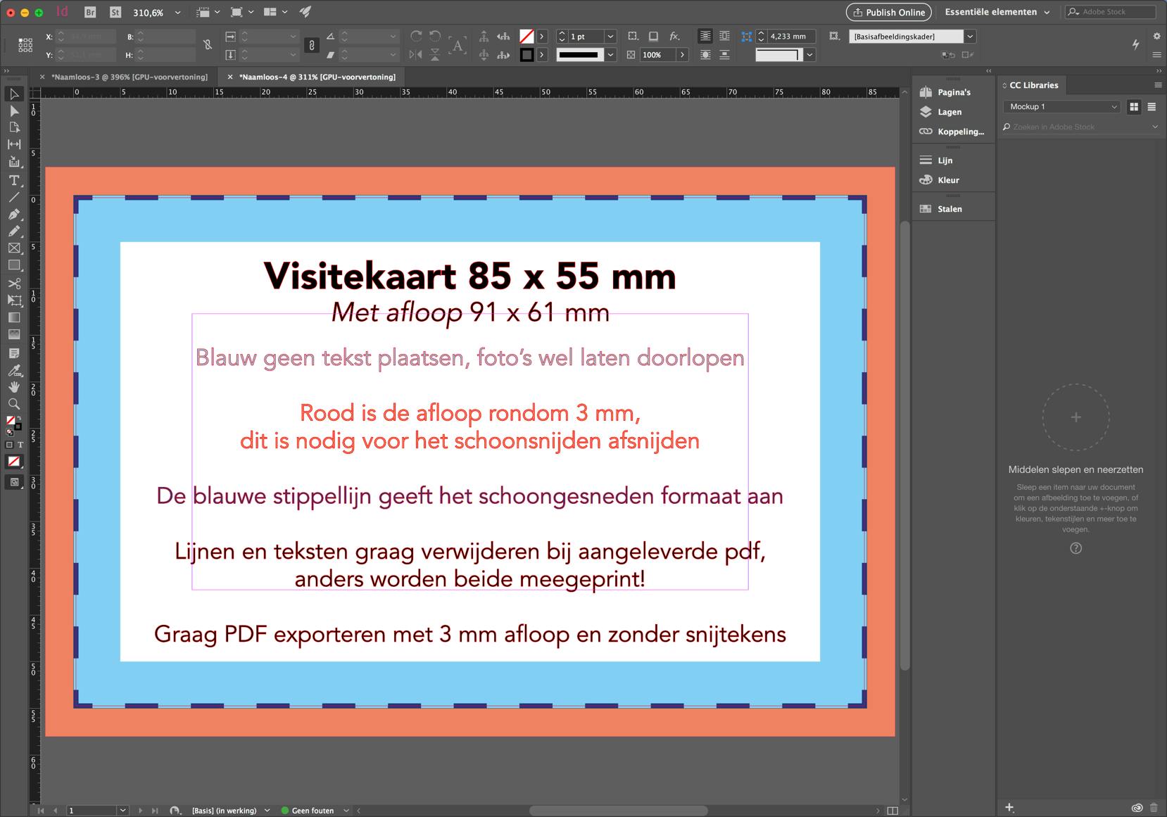 Uiteraard kun je het ontwerp uitbesteden aan een grafisch vormgever. Dat kost je in de meeste gevallen een aardige duit, maar het levert dan ook een kant-en-klaar professioneel resultaat. Wil je liever zelf aan de slag? Ook dat kan. Er bestaan heel wat diensten waar je de kaartjes kunt ontwerpen én afdrukken (zie Tip 4 en 5), maar je kunt ook zelf aan de slag met eigen software. Adobe InDesign CC is een professioneel dtp-pakket. Het maakt onderdeel uit van de Adobe Creative Cloud en kost 24,19 euro per maand. Er is echter een volledig werkende proefversie die je gedurende 30 dagen gratis kunt gebruiken. Om het juiste formaat te gebruiken – inclusief afloop en veiligheidsmarge – kun je beroep doen op je drukker. Op diens website vind je in de meeste gevallen een zogenaam idml-bestand dat als basis dient. Kijk bijvoorbeeld eens op www.oble.nl, www.esprinto.nl of www.slimdruk.nl voor de specificaties. Vind je het te moeilijk om met een blanco design te starten, gebruik dan een template. Maak bijvoorbeeld gebruik van www.stocklayouts.com of google eens op “free template business card”. Kies voor een bestand met een resolutie van 300 dpi en stel de kleuren in op CMYK.