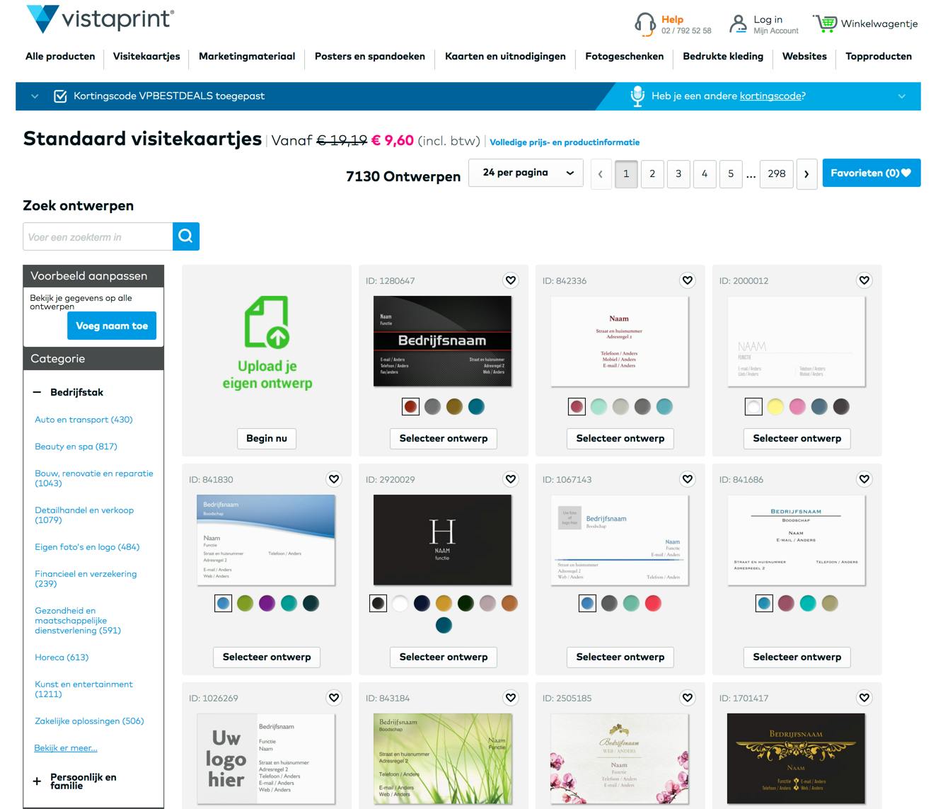 Een erg interessante dienst om kaartjes te ontwerpen én af te laten drukken is Vistaprint. Op www.vistaprint.nl klik je door naar Visitekaartjes en vervolgens start je met een van de drie voorgestelde papierkwaliteiten: Standaard, Deluxe of Superdik. Zodra je op Begin nu klikt, kun je grasduinen tussen duizenden sjablonen. In de linkerkolom filter je op basis van bedrijfstak, stijl, thema, kleur en ligging (horizontaal of verticaal). Als je een ontwerp gevonden hebt dat je mooi vindt, kun je het personaliseren met je eigen gegevens. De mogelijkheden zijn eindeloos. Je kunt een logo, foto of achterzijde toevoegen en de prijs wordt steeds automatisch bijgewerkt. Zodra je tevreden bent met het ontwerp, kies je het aantal visitekaartjes (van 100 tot 10.000 stuks), de afwerking (standaard, deluxe of metallic) en de papiersoort.