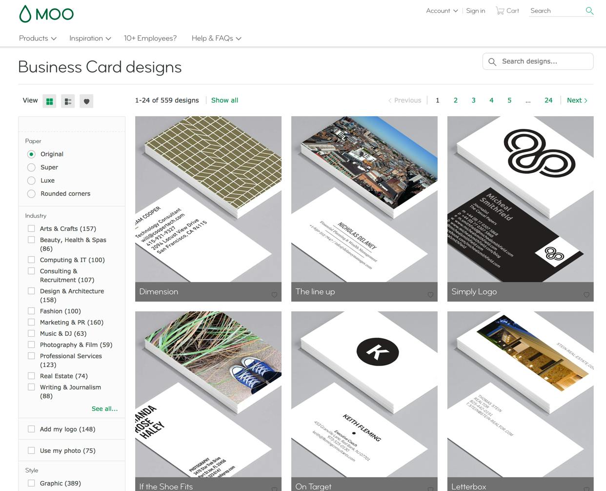 Een andere interesse dienst is moo.com. Deze Britse dienst heeft een originele product range. De grootste troef is Printfinity. Je kunt voor elk visitekaartje een unieke foto gebruiken. Dat valt vooral in de smaak bij fotografen en grafici, want op die manier is elk kaartje een verlengstuk van het portfolio. Ook hier heb je keuze uit diverse papiersoorten en afwerkingen zoals Gold Foil, Spot Gloss en Raised Spot Gloss. Het is ook mogelijk om postkaarten, stickers en labels te laten drukken. Eén van de grootste troeven van Moo.com is dat je minimaal slechts 50 kaartjes hoeft te bestellen. Bij andere diensten is dat vaak een veelvoud. Zodra je je papiersoort gekozen hebt, kun je aan de slag met de vele MOO Designs. Via Design your own kun je ook van scratch starten: via de online designer of via je eigen software (Photoshop, Illustrator of InDesign).