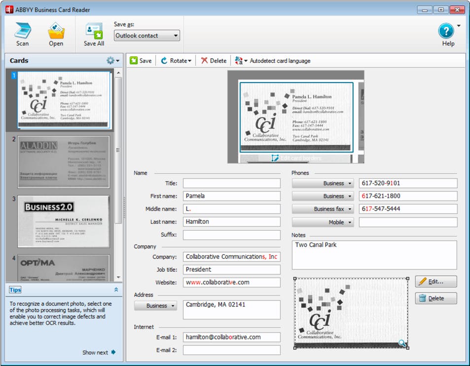 Heb je echt héél veel kaartjes en wil je geen secretaresse aannemen? Dan kun je ook kiezen voor speciale software die de klus uit handen neemt. ABBY Business Card Reader voor Windows (24,95 euro) werkt met nagenoeg elke flatbedscanner. De tool scant tot tien kaartjes tegelijkertijd en exporteert ze automatisch naar je database. De software werkt samen met Microsoft Outlook, maar ook met Salesforce. Cardiris 5 voor Windows en Mac (99 euro) is duurder maar gaat nog een stapje verder: deze software verwijdert automatisch duplicaten en is naast Outlook en Salesforce ook nog compatibel met Lotus Notes, Google Contacts en Microsoft Dynamics.