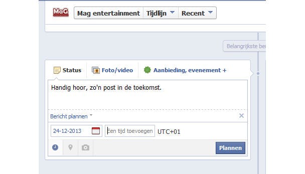 Klik op de kalender om de gewenste datum van de post te selecteren (dat kan dus zelfs vijf jaar in de toekomst zijn) en typ vervolgens in het veld daarnaast het tijdstip waarop je de post wilt plannen. Klaar? Klik dan op Plannen om de post daadwerkelijk in te plannen. Wil je een ingepland bericht bewerken of verwijderen, klik dan op je Activiteitenlogboek en bewerk of verwijder het bericht.
