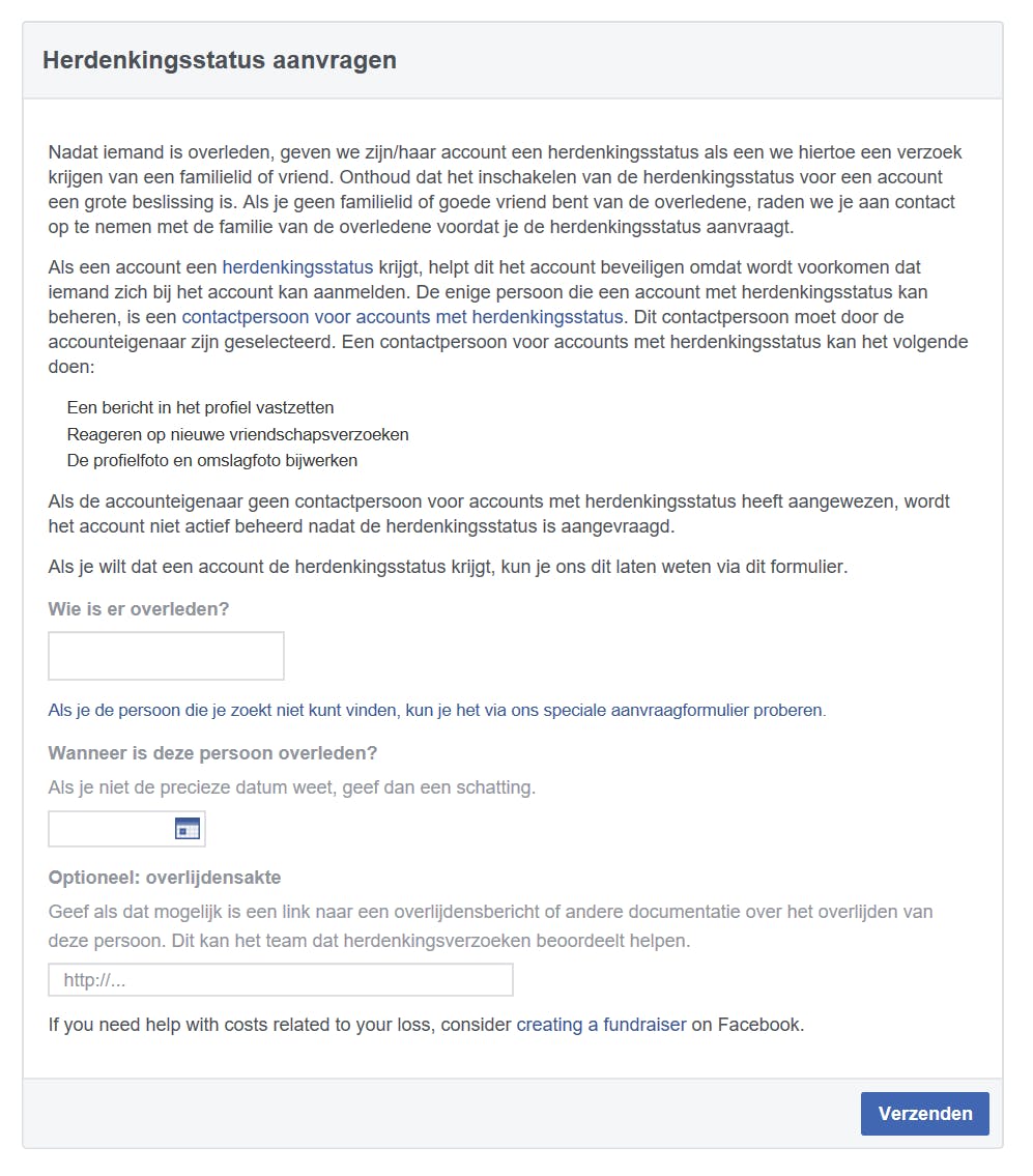 Is er iemand overleden, en wil je zijn/haar Facebook-account verwijderen? Facebook werkt alleen mee als je daarvan een bewijs overhandigt, bijvoorbeeld in de vorm van een overlijdensakte. Heb je dat niet, dan is een ander ‘bewijs van bevoegdheid’ als een volmacht, geboortebewijs, testament of verklaring van erfrecht ook mogelijk, in combinatie met een document dat de persoon is overleden (overlijdensbericht of rouwkaart). Beschik je over de benodigde documenten, dan kun je een verzoek tot opheffing indienen.