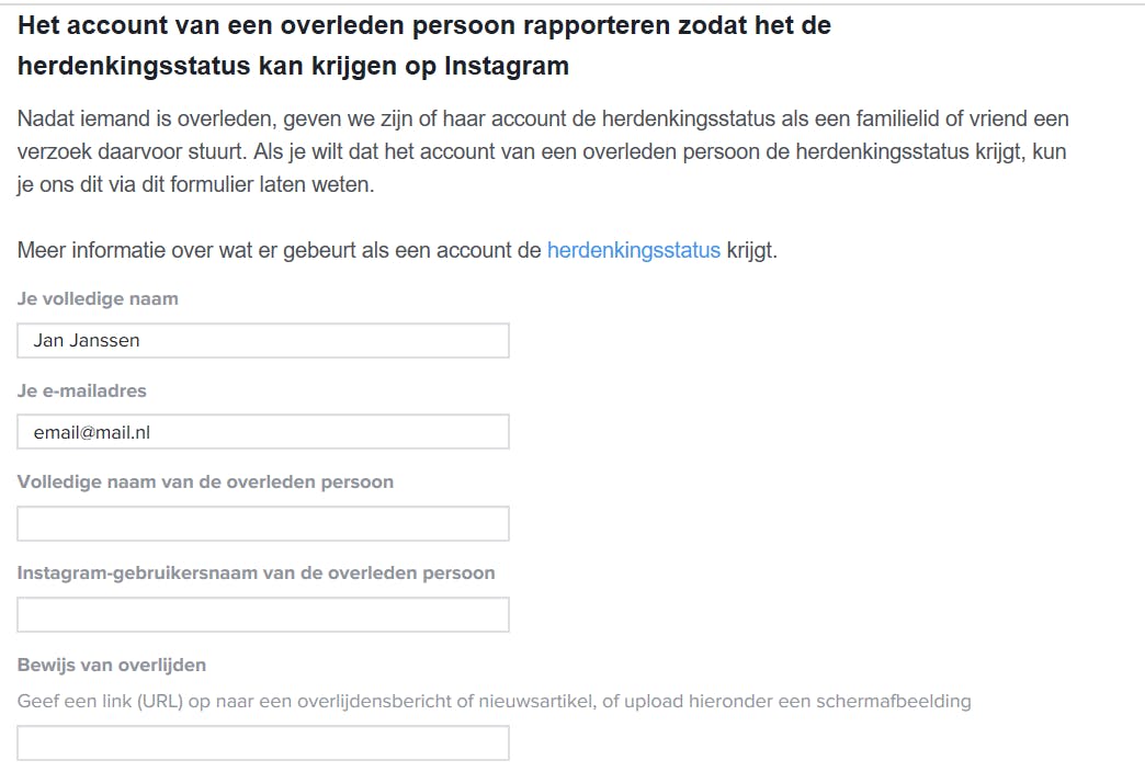 Wil je dat het Instagram-account een herdenkingsstatus krijgt? Ga naar Instagram om het formulier in te vullen. Geef hier de volledige naam op van de overleden persoon, evenals de naam van het account. Ook moet je een bewijs van overlijden overhandigen, naast een overlijdensakte mag dit ook een schermafbeelding van een overlijdensbericht of van een nieuwsartikel zijn. Een profiel van een account met herdenkingsstatus blijft volledig intact, maar kan niet meer worden aangepast (bijvoorbeeld met volgers, vind-ik-leuks en reacties) en wordt niet meer getoond in openbare gedeelten, zoals in het onderdeel Verkennen.