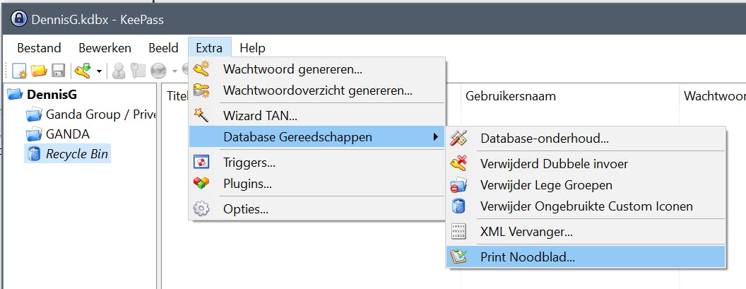 Bedenk ook goed wat er moet gebeuren met toegang tot andere diensten, bijvoorbeeld je online opslag bij Dropbox, je websites bij je hostingaanbieder en de accounts voor je favoriete webwinkels. Het is verstandig om gebruik te maken van een wachtwoordmanager, zodat al je aanmeldingsgegevens op een centrale locatie te vinden zijn. Een goede wachtwoordmanager biedt een noodservice: hierbij kun je je aanmeldingsgegevens in geval van nood aan een vertrouwenspersoon geven. KeePass is een veelgebruikte en gratis wachtwoordmanager. Om een zogeheten noodblad te maken, kies je voor Extra / Database Gereedschappen / Print Noodblad. Het noodblad geeft aan waar de database met wachtwoorden is opgeslagen, en waar je een eventuele back-up hiervan hebt bewaard. Ook bevat het formulier het hoofdwachtwoord, waarmee nabestaanden het databasebestand kunnen openen. Het noodblad is dus een uiterst krachtig middel om je nabestaanden in geval van nood toegang te geven tot allerlei diensten. Geef dit noodblad dus de plek die het verdient, bijvoorbeeld in een kluis (thuis of op een externe locatie, zoals de bank) of bij het testament, mocht je dat ergens veilig hebben liggen. Zorg er in elk geval voor dat je het noodblad bewaart op een plek waar alleen betrouwbare personen toegang toe hebben.
