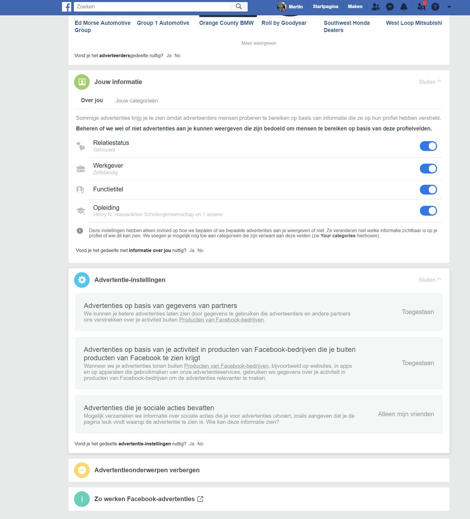 Facebook biedt al sinds jaar en dag de mogelijkheid om gepersonaliseerde advertenties uit te schakelen. Wat daarbij belangrijk is, is dat je alleen op Vind ik leuk klikt op dingen die je écht leuk vindt, want het zijn juist die gegevens die worden gebruikt om je advertenties voor te schotelen. Wanneer je echt alleen klikt op wat je leuk vindt, zou het zomaar kunnen zijn dat er ineens advertenties voorbij komen waar je ook daadwerkelijk wat aan hebt. Omgekeerd werkt het ook: je kunt advertenties die je niet meer wilt zien uitstekend verbergen. Daar is iedereen bij gebaat: zowel jij als de adverteerder. Een advertentie verberg je door op de drie stipjes naast de advertentie te klikken en vervolgens op Advertentie verbergen. Geef ook aan waarom je de advertentie niet meer wilt zien, dat heeft namelijk ook effect op de andere advertenties die je te zien krijgt. Als een adverteerder het echt heel bont maakt, kun je ook klikken op Advertentie rapporteren. Wil je gepersonaliseerde advertenties geheel uitschakelen, klik dan op het pijltje naar beneden naast het pictogram met het vraagteken bovenin en daarna op Instellingen. Wanneer je vervolgens klikt op Advertenties, kun je onder het kopje Advertentie-instellingen aangeven dat Facebook geen advertenties meer mag tonen op basis van je online activiteiten, binnen en buiten Facebook.