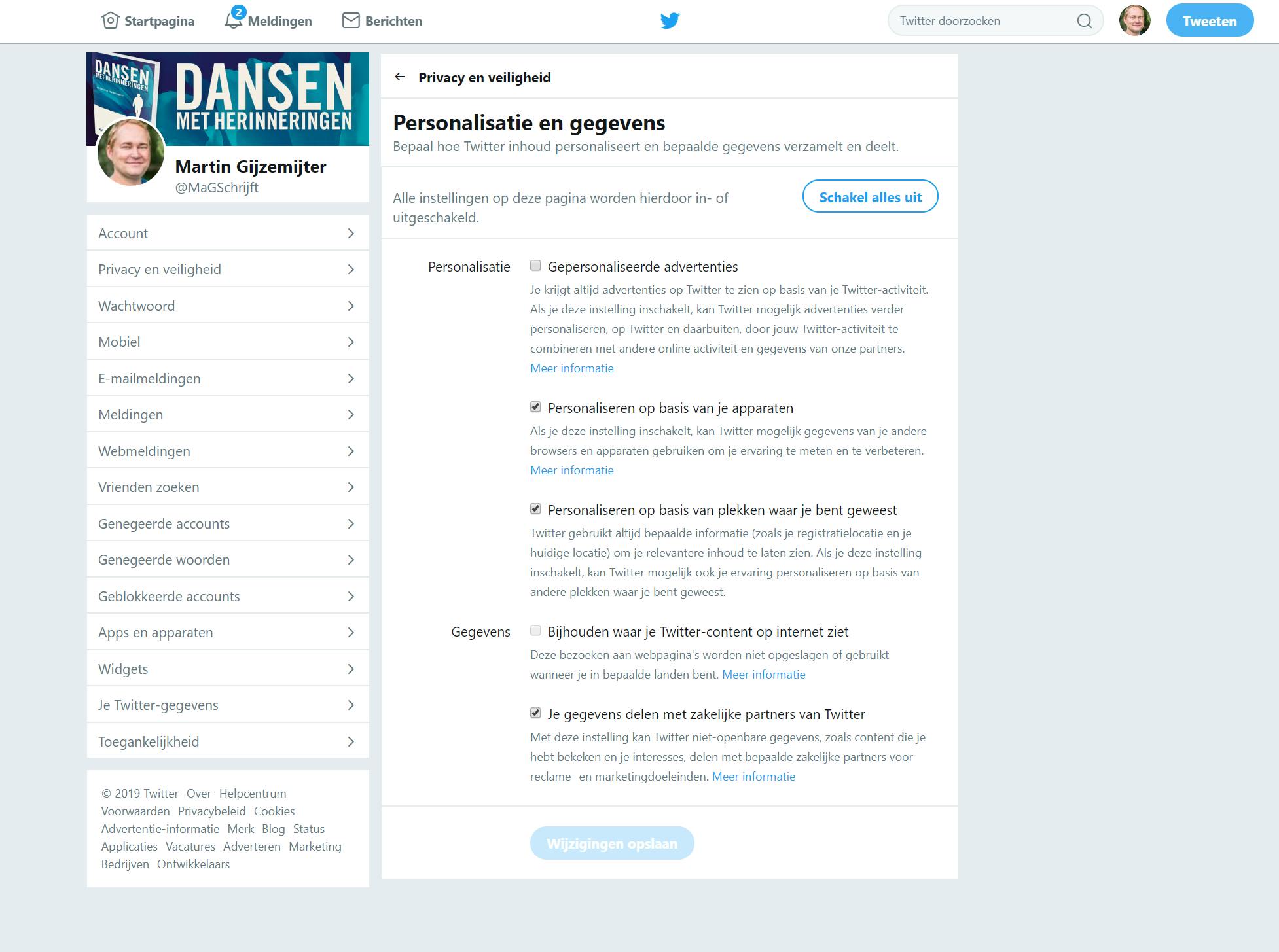 Twitter is uiteraard een heel ander medium dan Facebook en precies daarom wordt reclame op Twitter dan ook vaak als storender ervaren dan op Facebook. De reden daarvoor is dat Twitter zich meer gedraagt als een communicatiemedium: korte teksten, snelle berichten. Wanneer daar een advertentie tussen staat, dan is dat soms storend. Helaas is daar niets aan te doen, immers, ook Twitter bestaat dankzij z’n advertenties. Je kunt er echter ook hier voor zorgen dat Twitter z’n advertenties niet meer afstemt op je interesses. Dit doe je door op je profielfoto te klikken en daarna op Instellingen privacy. Klik op het tabblad Privacy en veiligheid en daarna op Wijzigen naast de optie Personalisatie en gegevens. Je kunt dan aangeven of Twitter z’n advertenties mag personaliseren op, bijvoorbeeld, je activiteit op Twitter, je activiteit op andere websites enzovoort. Vergeet ook niet om onder het kopje Jouw informatie aan te geven dat Twitter geen sociale gegevens van je mag gebruiken voor advertenties zoals je relatiestatus, werkgever enzovoort.