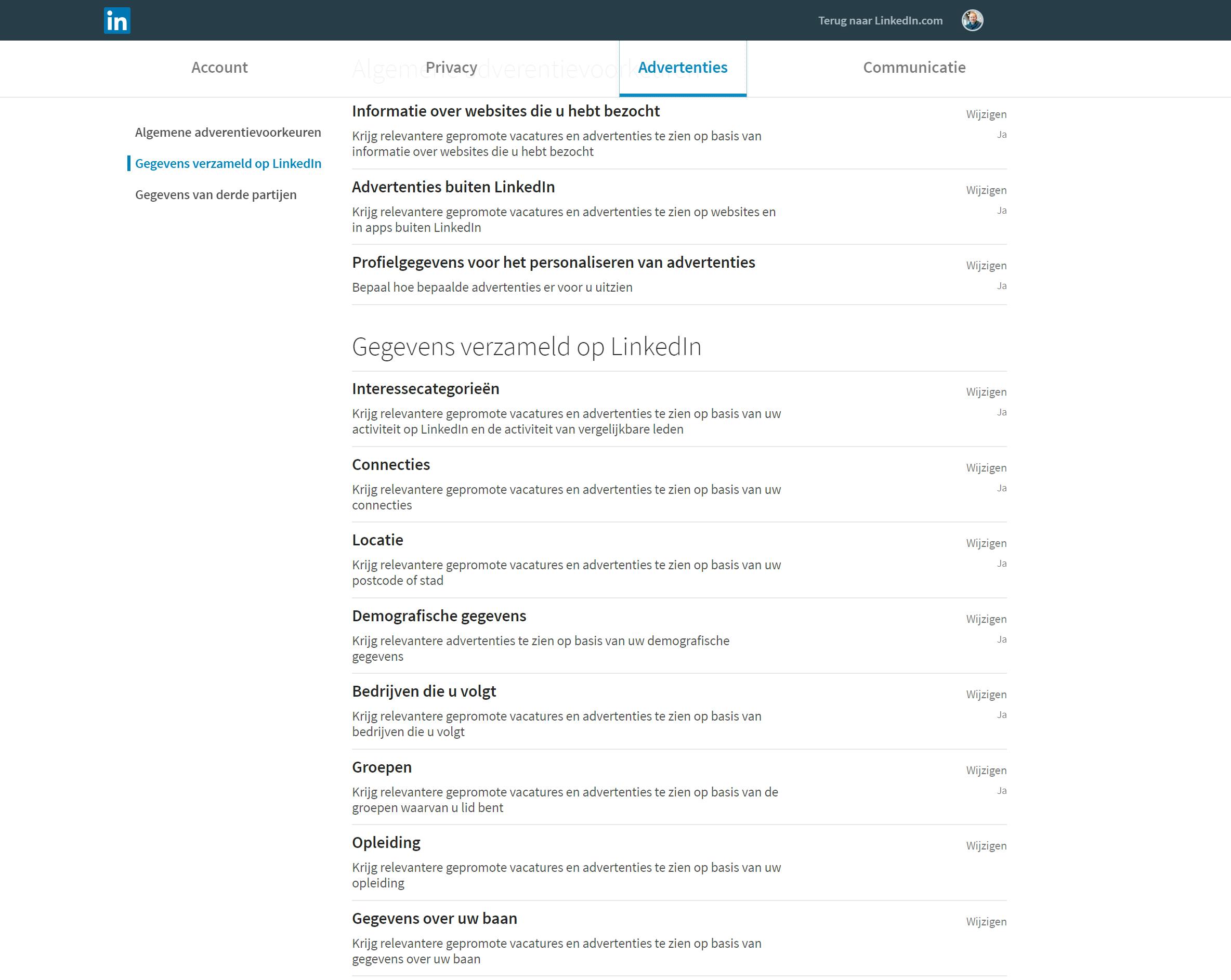 Hoewel we je bij vrijwel geen enkel sociaal netwerk zullen ontmoeten wanneer je gepersonaliseerde advertenties wilt uitschakelen, vinden we dat LinkedIn zo’n beetje het enige netwerk is waarbij je ze wellicht beter aan kunt laten staan. LinkedIn draait namelijk om netwerken, carrière, solliciteren enzovoort. Het merendeel van de advertenties op LinkedIn bestaat, afhankelijk van het soort account dat je hebt, uit vacatures die zijn afgestemd op je eigenschappen, capaciteiten, werkervaring enzovoort. Dat is nou zo’n zeldzame situatie waarin gepersonaliseerde advertenties fantastisch zijn. Wil je ze echter toch liever uitschakelen, dan kan dat wel. Klik op LinkedIn op je profielfoto en vervolgens op Instellingen en privacy. Er verschijnt nu een flinke pagina met instellingen, waarna je klikt op het tabblad Advertenties. Je ziet hier direct dat LinkedIn je veel meer controle geeft dan welk sociaal netwerk dan ook over de gegevens die er over je verzameld worden en die gebruikt worden voor persoonlijke advertenties. Klik op Wijzigen bij de optie die je wilt aanpassen om aan te geven hoe je het wél wilt instellen.