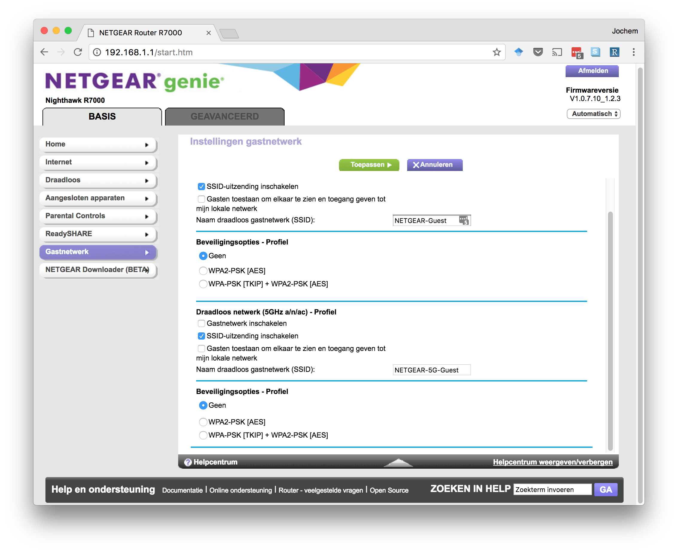 Je schakelt het gastnetwerk in door in te loggen in je router, als die de functie ondersteunt. Zoek daarvoor even het gateway-adres van je router (zie kader ‘Inloggen in je router’). Eenmaal ingelogd, zoek je in je router tussen de opties voor het draadloze netwerk een optie als Gastnetwerk (guest network). Schakel die optie in. Zorg ervoor dat je een wachtwoord instelt op het gastnetwerk en het gastnetwerk beveiligt met wpa2-aes.