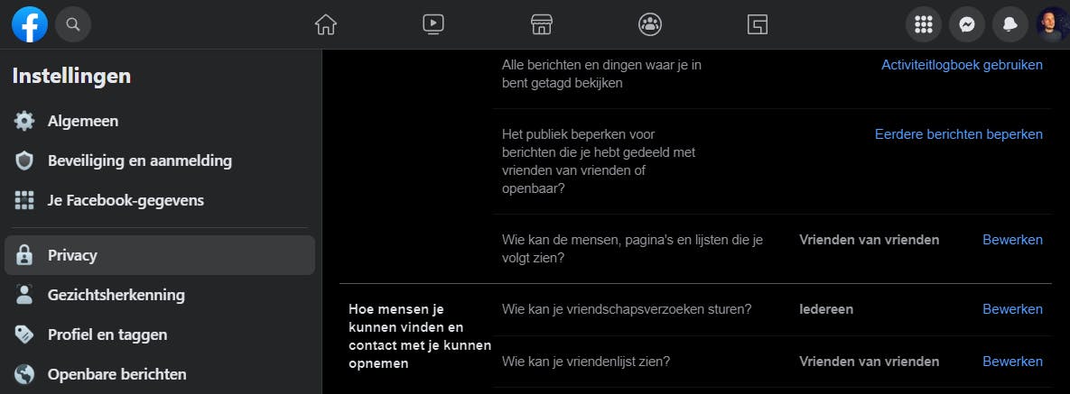 In het linkermenu vind je de optie Privacy en hier moet je zijn om je vriendenlijst af te schermen. Bij de sectie Hoe mensen je kunnen vinden en contact met je kunnen opnemen klik je naast Wie kan je vriendenlijst zien? op Bewerken. Vervolgens vind je in het dropdownmenu meerdere opties om je vriendenlijst af te schermen.
