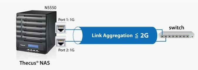 Een NAS met een dubbele netwerkaansluiting kun je dankzij link aggregation in combinatie met een geschikte switch via een 2Gbit/s-verbinding aansluiten op je netwerk.