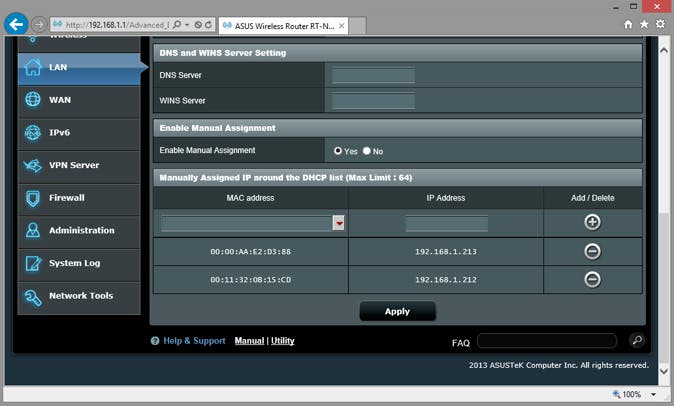 Via je router is een fraaiere manier, je NAS blijft op automatisch staan en zal in de toekomst moeiteloos ook op een ander netwerk of nieuwe router werken. Hiervoor wordt het MAC-adres van het netwerkapparaat opgegeven in de router in combinatie met het IP-adres dat je wilt toewijzen. Het MAC-adres (Media Access Control) is een unieke tekenreeks waarmee een netwerkapparaat geïdentificeerd kan worden. De optie om DHCP-reserveringen te doen, wordt door iedere routerfabrikant anders genoemd. We zijn termen als 'Manually Assigned IP around the DHCP list', 'DHCP Reservations', 'DHCP-reserveringen' en 'Static Lease' tegengekomen voor deze functie.