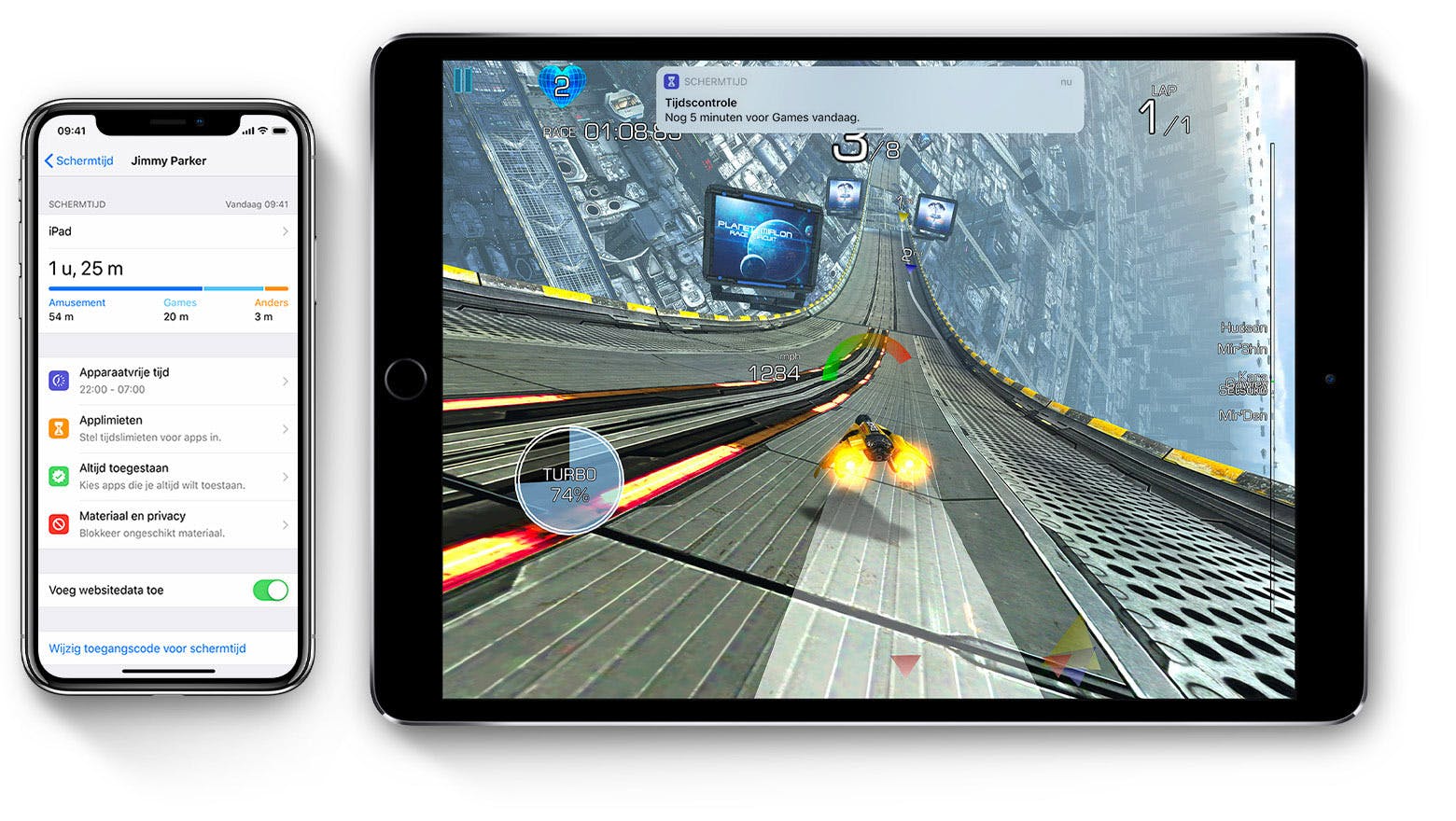 Schermtijd is een nieuwe functie voor iOS 12 waarmee je kunt bijhouden hoeveel tijd je kind besteedt aan de iPad en de applicaties. Ook kunnen er limieten op de speeltijd worden ingesteld. Als het apparaat van je kind is geconfigureerd, kun je via Delen met gezin vanaf je eigen Apple-apparaat rapporten bekijken en instellingen aanpassen. Kinderen jonger dan 13 jaar kunnen geen eigen Apple ID aanmaken en moeten altijd lid zijn van een gezin.