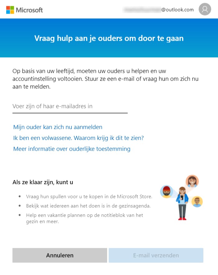 Microsoft is al lang bezig met het faciliteren van beperking van pc-gebruik door kinderen. Dat begon met hun ‘Family Safety’-dienst en is voor Windows 10 verder uitgebouwd. Inmiddels is de dienst aardig volwassen en worden gegevens niet alleen per computer, maar ook online vastgelegd tussen Windows 10-systemen en Xbox-systemen. Zo kun je vanaf een website zowel de Xbox als de Windows 10-systemen in de gaten houden. Om een account voor je kind te registreren ga je hiernaartoe. Na het invullen van de geboortedatum is bevestiging nodig van een van de ouders. Klik op Mijn ouder kan zich nu aanmelden om het account te bevestigen met je eigen e-mailadres. Na het bevestigen wordt het kinderaccount automatisch toegevoegd aan een gezinsgroep.