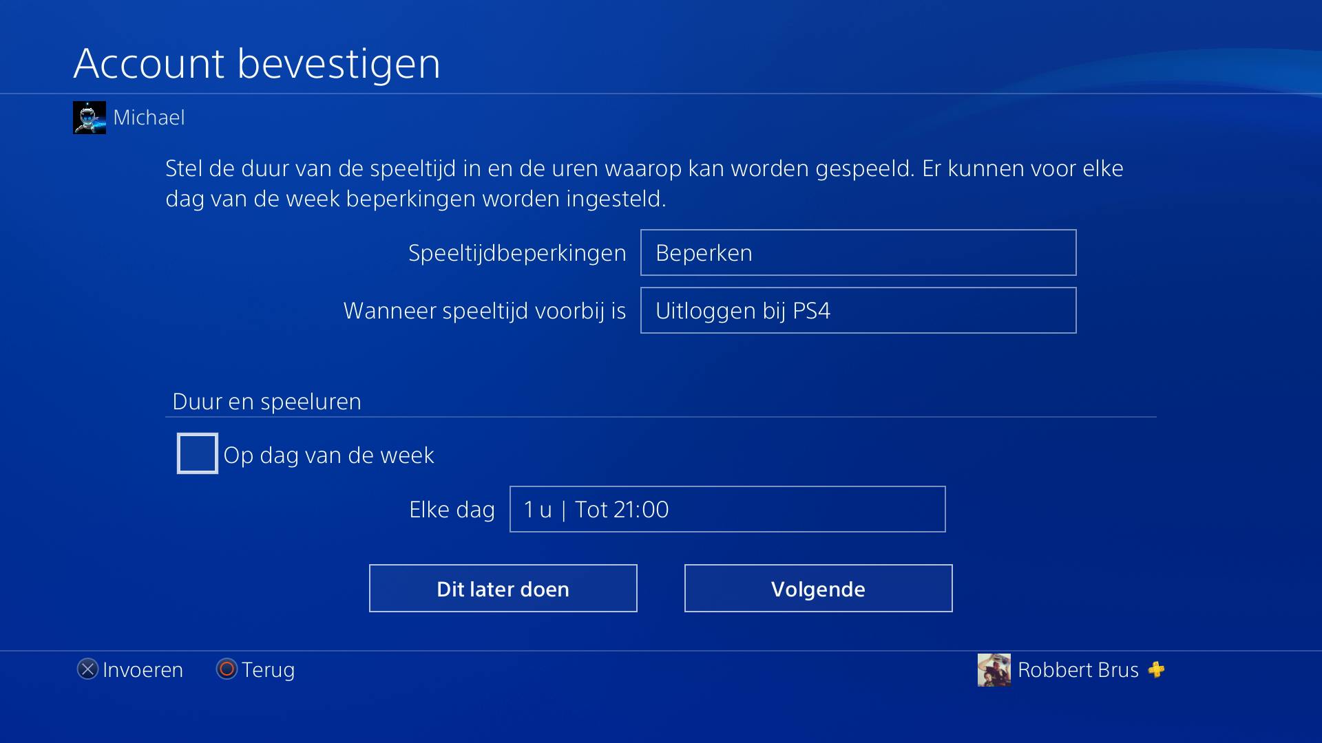 Ook op de PlayStation 4 kan de speeltijd worden ingesteld via een kinderaccount. Om een kinderaccount aan te maken klik je in het beginscherm op Nieuwe gebruiker. Kies Een gebruiker maken en ga naar Volgende om een PlayStation Network-account te maken. Doorloop de gevraagde stappen en uiteindelijk zal gevraagd worden om de familiemanager in te laten loggen om het account te bevestigen. Tijdens deze stappen zal ook gevraagd worden om speelbeperkingen in te stellen. Kies achter Speeltijdbeperkingen voor de optie Beperken en geef eventueel als consequentie eronder Uitloggen bij PS4. De tijd kan per week worden ingesteld. Wanneer de instellingen opgeslagen zijn en het account is toegevoegd kan het kind op zijn of haar eigen account inloggen. Achteraf de tijden wijzigen kan via het account van de familiebeheerder. Ga op zijn account naar Instellingen / Ouderlijk toezicht/Familiebeheer en selecteer de het account dat je wilt aanpassen.
