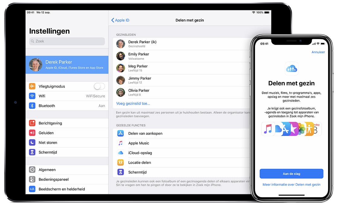 Om delen met het gezin in te schakelen ga je naar Instellingen en tik je op je naam. Tik vervolgens op Delen met gezin en Aan de slag. Volg de instructies op het scherm om de gezinsgroep te configureren. Als de groep gemaakt is kun je een id creëren voor een kind jonger dan 13 jaar. Ga naar Instellingen en tik op je naam. Kies voor Delen met gezin en open Voeg gezinslid toe. Tik op Maak account voor kind aan en ga naar Volgende. Geef de juiste geboortedatum op en doorloop de gewenste stappen. Let erop dat je Vraag om te kopen inschakelt om te voorkomen dat je kind ongelimiteerd aankopen kan doen.