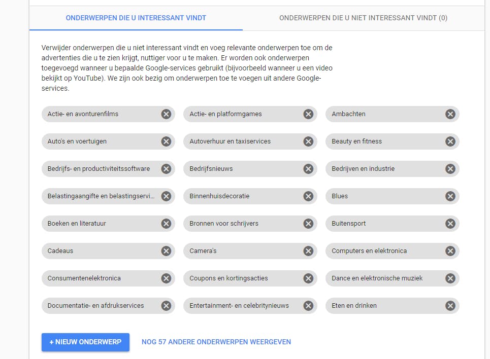 Hoe zit het eigenlijk met tracking cookies? Die zijn wel slecht toch? De Europese Unie heeft er zelfs een speciale wet voor aangenomen. Oef, ja, die verschrikkelijke cookiewet. Die is bedoeld om mensen bewuster te maken van cookies. Maar deze wet heeft vooral geleid tot een situatie waarin we allemaal op Accepteren klikken, omdat de website anders niet lekker meer werkt. Zolang tracking cookies gebruikt worden waar ze voor bedoeld zijn – het voorschotelen van reclame die je waarschijnlijk interessant vindt – zien we daar absoluut geen kwaad in. Vooral niet omdat de informatie niet tot het individu te herleiden is. Wij raden je af om álle cookies uit te schakelen, zelfs als je totaal geen interesse hebt in reclame op basis van je interesses (want dat is wat cookies onder andere realiseren). Websites functioneren namelijk vaak niet meer goed zonder cookies: je voorkeuren worden bijvoorbeeld ook in een cookie vastgelegd. We raden je vooral aan om de instellingen van de diensten die je gebruikt aan te passen, zodat je er zo min mogelijk last van hebt. Hoe? Dat zullen we je in de volgende tips laten zien.