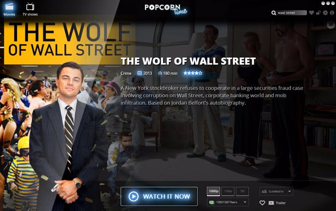 Op Popcorn Time zijn er diverse titels van Dutch Filmworks beschikbaar, zoals de Amerikaanse kaskraker The Wolf of Wall Street.