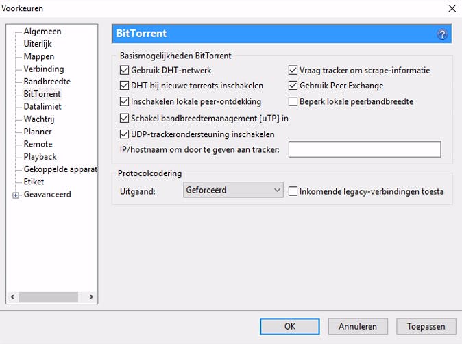 Als extra beveiligingslaag kunt je in geschikte downloadprogramma's inkomend en uitgaand dataverkeer versleutelen. Bovendien hebben veel applicaties een optie om downloadverkeer via een zogeheten proxyserver om te leiden. BTGuard is bijvoorbeeld een bekende aanbieder om torrents via een proxyserver te anonimiseren. Net als VPN-aanbieders kost ook het gebruik van een betrouwbare proxyserver geld. Wanneer je niet van plan bent om diverse beveiligingsfuncties te combineren, is het gebruik van een goede VPN-server de beste keuze.