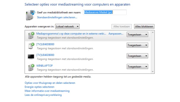Hoe je precies gedeelde mappen aanmaakt op een computer lees je hier. Voor het streamen van muziek en films is het gemakkelijker om een mediaserver in te richten. Op Windows-machines gebruik je hiervoor het programma Windows Media Player. Klik bovenaan op Streamen / Mediastreaming inschakelen. Vervolgens kies je nogmaals voor Mediastreaming inschakelen. Bedenk in het bovenste tekstveld een logische naam voor je mediaserver. Als er apparaten in je netwerk zijn ingeschakeld, zie je in het overzicht hiervan de naam staan. Per apparaat geef je toestemming om muziek en films vanaf de mediaserver op je pc te streamen.