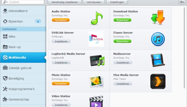 Open het onderdeel Package Center en kies aan de linkerkant voor Multimedia. Onder Mediaserver klik je vervolgens op Installeren. Open vervolgens File Station. Mediabestanden die je toevoegt aan de mappen music, photo en video zijn automatisch beschikbaar op afspeelapparatuur in je netwerk. Voorwaarde is wel dat deze apparaten DLNA en/of UPnP ondersteunen.