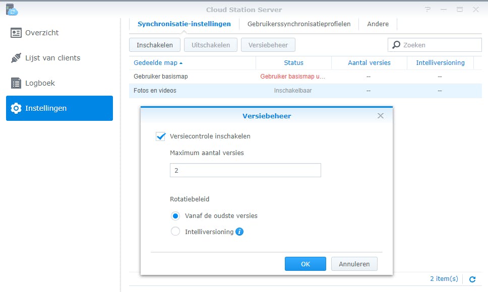 Vanwege de hoge bestandscapaciteit is een nas uitermate geschikt voor back-updoeleinden. Hiervoor bestaan allerlei mogelijkheden. Wil je van computergegevens periodiek een exacte kopie op de nas bewaren? Synology heeft hiervoor prima oplossingen beschikbaar. Allereerst installeer je op het netwerkstation de toepassing Cloud Station Server. Klik binnen DSM op Package Center en zoek in de applicatielijst de genoemde toepassing op. Bevestig met Installeren / Ja. Via Openen kom je in de gebruikersomgeving van Cloud Station Server terecht. Je geeft nu aan welke gedeelde map(pen) op de nas je als doellocatie voor de back-up wilt gebruiken. Ga aan de linkerkant naar Instellingen en klik op een gedeelde map waarin je straks de back-up(s) wilt bewaren. Bevestig bovenaan met Inschakelen en bepaal desgewenst hoeveel versies je van de bewaarde bestanden wilt bewaren. Handig voor het geval je in de toekomst eens oudere versie van een bestand wilt herstellen, zoals een bewerkte foto. Maak een keuze en klik op OK / OK.