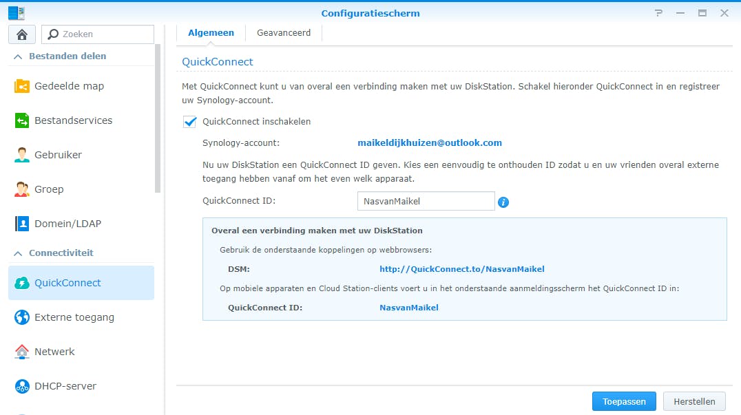 Wie vanaf verschillende apparaten vaak op een Synology-nas inlogt, doet er verstandig aan om een zogeheten QuickConnect ID te gebruiken. Hiermee geef je het netwerkstation min of meer een eigen domeinnaam, zodat je zowel binnen als buiten je thuisnetwerk eenvoudig bij je bestanden kunt komen. Een groot voordeel is dat je hiermee geen geavanceerde instellingen van je router hoeft te wijzigen. Navigeer binnen DSM naar Configuratiescherm / QuickConnect. Waarschijnlijk heb je tijdens de configuratie van de nas al een Synology-account met QuickConnect ID aangemaakt. Zet zo nodig een vinkje voor QuickConnect inschakelen. Ga onderaan akkoord met de voorwaarden en bevestig met Toepassen. Het webadres waarmee je jouw nas altijd en overal kunt bereiken verschijnt in beeld. Deze url begint altijd met http://quickconnect.to/ gevolgd door een zelfgekozen naam.