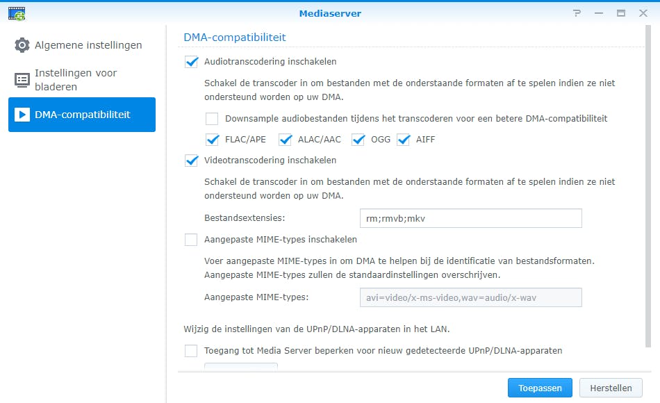 Een nas beschikt over ideale eigenschappen om media op te slaan en de bestanden vervolgens te delen met diverse afspeelapparaten binnen je thuisnetwerk. Denk aan een computer, smart-tv, mediaspeler, muzieksysteem of gameconsole. Er is immers voldoende opslagcapaciteit beschikbaar om allerlei films, series, muziekalbums en foto’s op te slaan. Vanwege het lage energieverbruik kun je een nas continu ingeschakeld laten, zodat de mediabestanden altijd bereikbaar zijn. Om mediabestanden vanaf een nas naar overige apparaten te streamen, activeer je op het netwerkstation allereerst een dlna-mediaserver. Dankzij het dlna-protocol kunnen verschillende apparaten media met elkaar delen zonder dat de gebruiker allerlei geavanceerde instellingen hoeft te wijzigen. Open binnen DSM het Package Center en klik onder Mediaserver op Installeren. Via Openen selecteer je achter DMA-menutaal de optie Nederlands. Bevestig met Toepassen. De kans bestaat dat jouw audiosysteem, smart-tv of mediaspeler een bepaald bestandsformaat niet ondersteunt. Via het onderdeel DMA-compatibiliteit vink je daarom de opties Audiotranscodering inschakelen en Videotranscodering inschakelen aan. Klik op Toepassen. Overigens is de mogelijkheid om video’s naar een ander formaat te transcoderen niet op iedere Synology-nas beschikbaar.