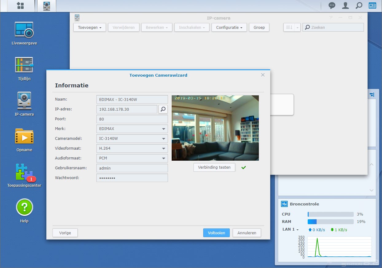 Zodra je Surveillance Station voor de eerste keer opstart, verschijnen er introductiemeldingen in beeld. Klik deze vensters weg. Voordat je een ip-camera aan het videobewakingssysteem toevoegt, koppel je het apparaat eerst aan het (draadloze) thuisnetwerk en gebruik hiervoor de bewakings-app van het bewuste cameramerk. Ga daarna binnen Surveillance Station achtereenvolgens naar IP-camera / Toevoegen / Camera toevoegen en selecteer de optie Snelle installatie. Via Volgende klik je op het pictogram met het vergrootglas. Staat je camera in de lijst? Klik erop en kies voor OK. Als de ip-camera niet vanzelf opduikt, vul je het ip-adres en het poortnummer in. Voer daarnaast de juiste inloggegevens in. Naar eigen inzicht pas je het video- en audioformaat eventueel nog aan. Controleer het camerabeeld door te klikken op Verbinding testen en sluit af met Voltooien. Via Bewerken / Bewerken / Opname-instellingen bepaal je onder meer hoeveel dagen je opnames wilt bewaren. Open het tabblad Planning en geef in het rooster aan op welke dagen en tijdstippen je bewegingsdetectie wilt activeren. Constateert de camera beweging, dan bewaart Surveillance Station de opname op je nas. Overigens kun je ook continu opnemen. Houd je graag onderweg een oogje in het zeil? Voor Android en iOS installeer je hiervoor de app DS Cam.